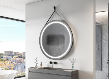 Okruglo ogledalo s rasvjetom pričvršćeno na kožni remen je dostupno u tri boje po izboru: crno, svijetlosmeđe i tamnosmeđe. Zahvaljujući mogućnosti personalizacije možete prilagoditi ogledalo Vašem ukusu i stilu prostorije. Stilski remen od prave kože.