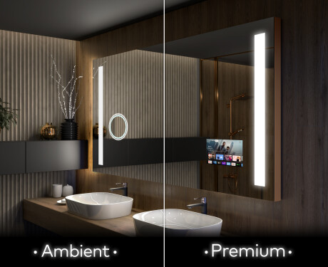 Osnova za personalizaciju ovih modernih ogledala je izbor tehnologije - PremiumLine i AmbientLine nude razne mogućnosti. U svakoj verziji Vi odlučujete kako će izgledati Vašekupaoničko ogledalo. 2 LED trake, koje su osnova pozadinskog osvjetljenja, mogu imati boju i intenzitet po želji. Vaše ogledalo može biti opremljeno dodatnim osvijetljenim kozmetičkim ogledalom s povećanjem, satom i meteorološkom stanicom, pa čak i zaslonom na kojem možete gledati seriju sa streaming platforme.
